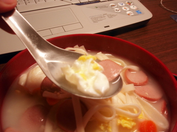 我在這邊建議,當麵快要煮好之前,可以打顆蛋,或是加一些鹽巴才可以讓湯更有味道喔!!如果在喝湯頭時味道太淡,可以試著在加一片起司片來增加起司的味道也是可以的。